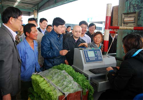 在蔬菜交易現場,無錫朝陽集團總經理楊興德向部領導介紹了網絡化的電子秤交易架構,這些交易信息通過網絡,向下游零售環節傳遞產地信息。