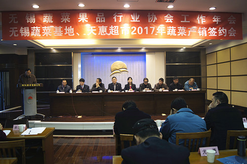 無錫蔬菜果品行業(yè)協(xié)會2016年工作年會、無錫蔬菜基地、無錫天惠超市股份有限公司2017年蔬菜產(chǎn)銷簽約會于12月7日上午,在朝陽股份農(nóng)產(chǎn)品市場二樓會議室隆重召開。蔬果行業(yè)協(xié)會會員、基地菜農(nóng)、朝陽股份和天惠超市主要領(lǐng)導(dǎo)200余人出席了會議。