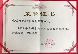 無錫天惠超市股份有限公司榮獲2016年度無錫市行業(yè)衛(wèi)生協(xié)會先進(jìn)集體稱號