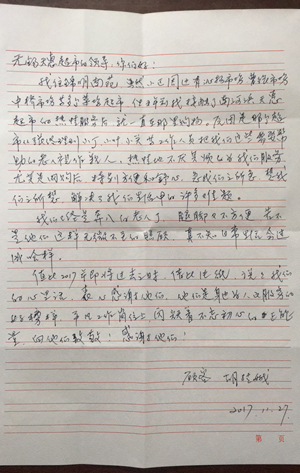 無錫天惠超市的領(lǐng)導: 你們好! 我住錦明南苑,雖然小區(qū)周邊有沁揚市場、曹張市場、中橋市場等多個菜場超市,但五年前我接觸了南河浜天惠超市的熱情服務后,就一直在那里購物。原因是那個超市從張經(jīng)理到小丁、小葉、小關(guān)等工作人員把我們這些需要幫助的老人視作親人,熱情地不厭其煩的為我們服務,尤其是網(wǎng)購后特別方便和舒心。急我們之所急,想我們之所想,解決了我們生活中的許多難題。 我們已經(jīng)是奔八的老人了,腿腳又不方便,若不是他們這樣無微不至的照顧,真不知日常生活會過成啥樣。 值此2017年即將過去之時,借此筆紙說出我們的心里話,衷心感謝他們,他們是身邊為人民服務的好榜樣,平凡工作崗位上閃耀著不忘初心的正能量,向他們致敬!感謝他們! 顧客 胡桂娥 2017.11.27