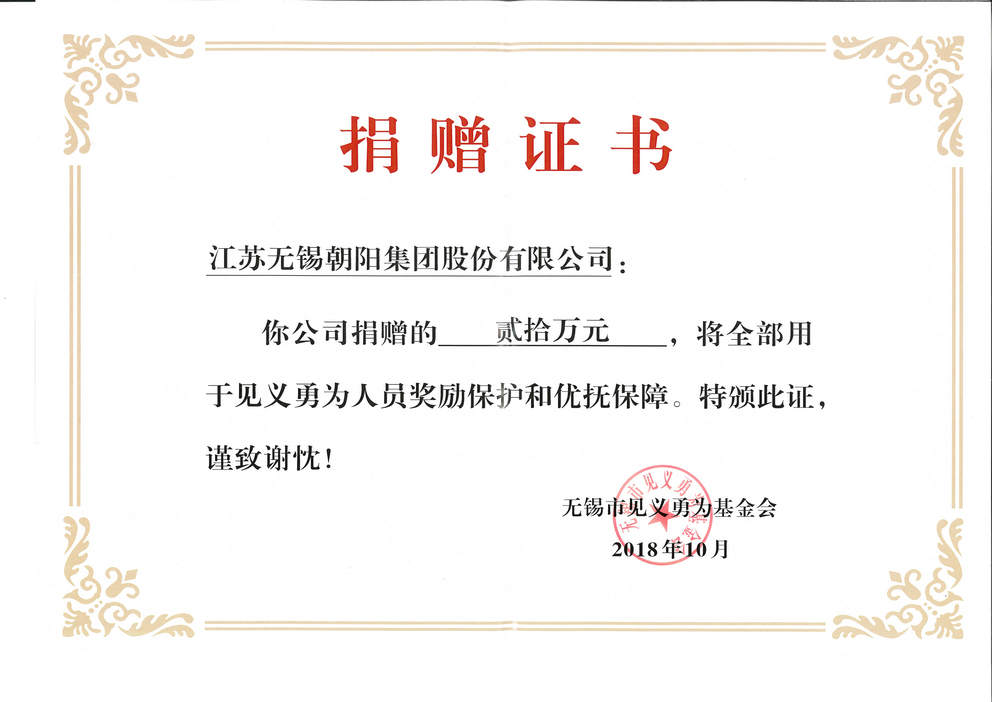 江蘇無錫朝陽集團股份有限公司向市見義勇為基金會捐款20萬元