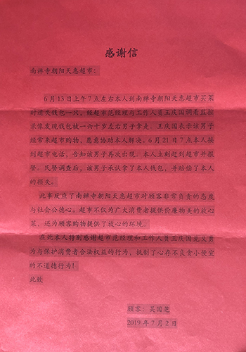 南禪寺朝陽天惠超市: 6月13日上午7點左右本人到南禪寺朝陽天惠超市買菜時遺失錢包一只,經超市范經理與工作人員王慶國調看監控錄像發現錢包被一六十歲左右男子拿走。王慶國表示該男子經常來超市購物,愿意協助本人解決。6月21日7點本人接到超市電話,告知該男子再次出現。本人立刻趕到超市并報警。民警調查后,該男子承認拿了本人錢包,并賠償了本人的損失。 此事反應了南禪寺朝陽天惠超市對顧客非常負責的態度與社會公德心。超市不僅為廣大消費者提供價廉物美的放心菜,還為顧客購物提供了放心的環境。 在此本人特別感謝超市范經理和工作人員王慶國見義勇為與保護消費者合法權益的行為,抵制了心存不良貪小便宜的不道德行為! 此致