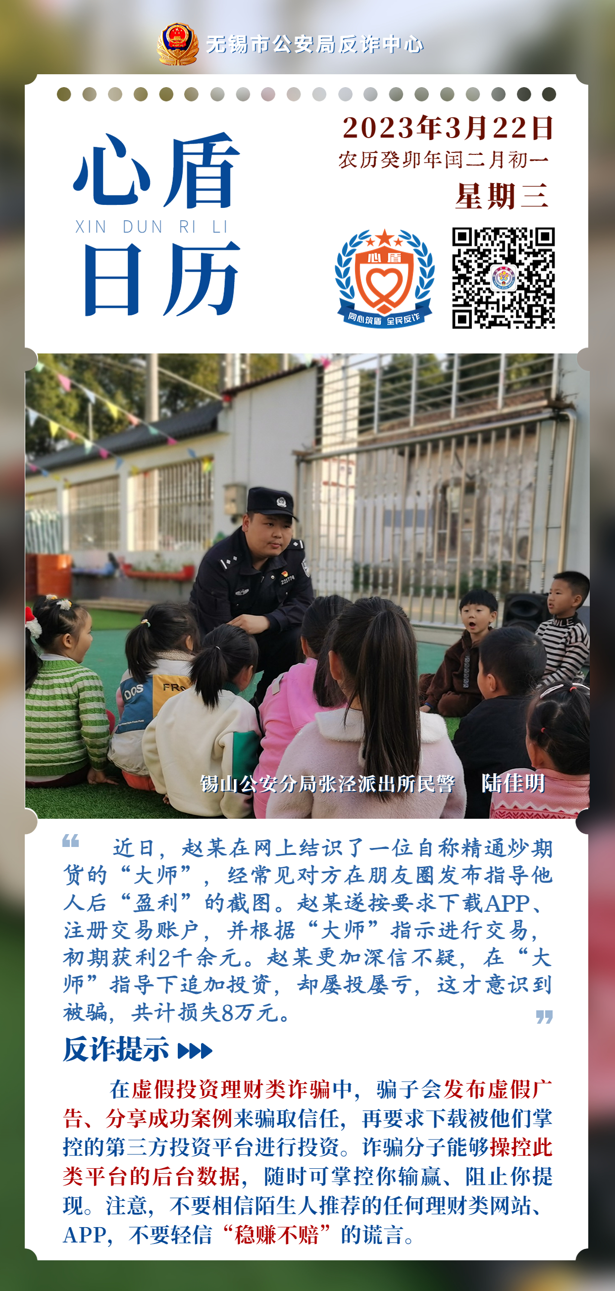 近年來,隨著智能化手機的廣泛運用,各種電信詐騙手段層出不窮,經常能在媒體上看到各種被騙人員的經歷。但靠媒體或者被騙人員的口口相傳,畢竟不如專業人員的分析來的可靠。 隨著政府對反詐的越來越重視,同時為了能夠增強市場從業人員的反詐意識和防騙知識,市場邀請劉潭派出所毛警官加入客戶微信群,用實際案例以“心盾日歷”的形式,每天在客戶群里宣傳一個詐騙小故事以及對詐騙手段的分析和如何防范著手,為客戶樹立起防詐心盾,盡可能的降低客戶因不了解而上當受騙的幾率。 市場會將反詐宣傳作為常態化的工作來做,更會在合適的時機邀請派出所的警官來市場以座談會的形式進行反詐宣傳教育,從實際案例講解到如何防范著手,切實保障商戶來之不易的經營所得,不給犯罪分子可乘之機。(供稿人:奚赟賾) |