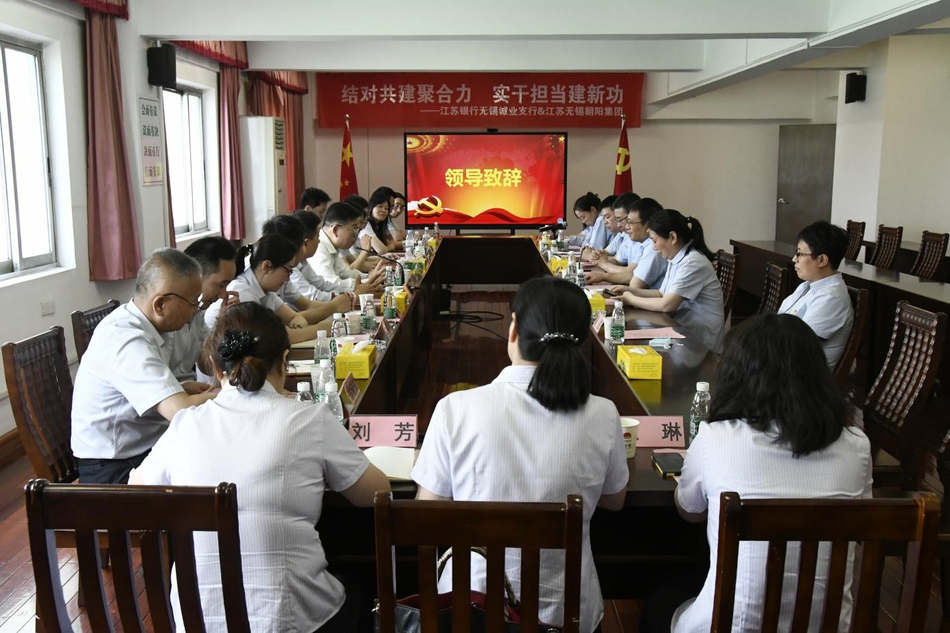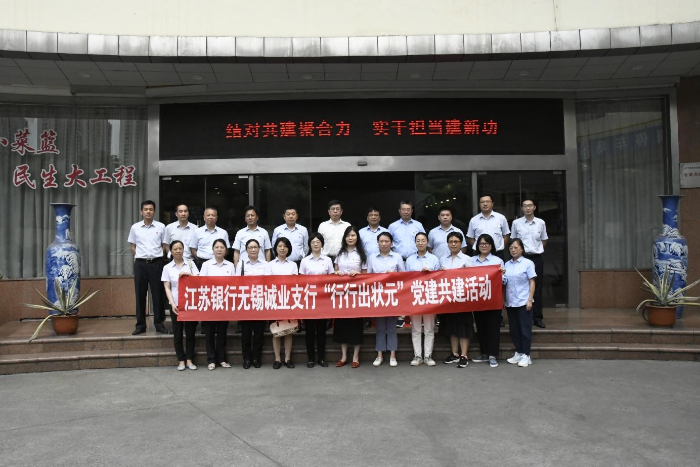 6月16日上午,江蘇銀行無錫誠業支行與江蘇無錫朝陽集團在朝陽農產品大市場攜手舉辦黨建共建活動,深入學習黨的二十大精神,全面貫徹習近平新時代中國特色社會主義思想,進一步加強黨建引領,暢通銀企雙方溝通渠道,實現黨建共建優勢互補。江蘇銀行誠業支行行長、黨支部書記宗亮,朝陽集團黨委書記、工會主席錢韌等23位黨員代表參加本次活動。