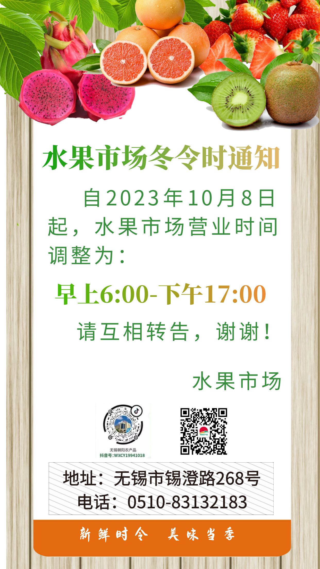 自10月8日起,朝陽股份水果市場營業時間作季節性調整,由原來的早上5:00~下午17:00調整為: