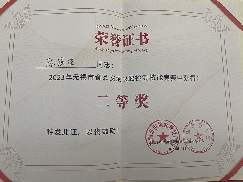 為切實守護好市民的菜籃子,進一步發揮食品安全快檢水平,積極推進食品安全能力建設,有效保障人民群眾食品安全,11月16日,無錫市市場監督管理局和無錫市總工會聯合舉辦了2023年無錫市食品安全快速檢測技能競賽。在比賽中,無錫朝陽股份有限公司檢測中心主任陳穎佳榮獲二等獎。