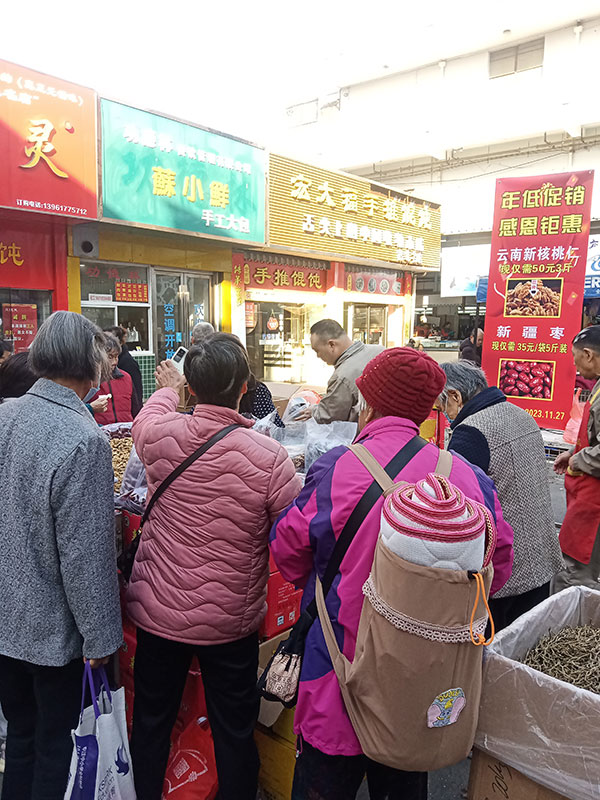 小雪時節,草木凋零,冰凍蟲伏,這是冬補養生的大好時節,家家戶戶都忙著準備進補食材。朝陽農貿市場適時開展了南北干貨惠民展銷會,讓我們一起走近現場看看吧。 在水產區廣場上,很多攤位前都圍滿了人。比如在靈德靈店鋪前的干貨攤位上擺滿了核桃肉和紅棗,價格也相當親民,云南核桃仁17元/斤,新疆紅棗7元/斤。據老板介紹,云南的核桃仁口感偏酥,更適合無錫這邊的口味。新疆紅棗的口味則是肉感十足,棗香四溢。
