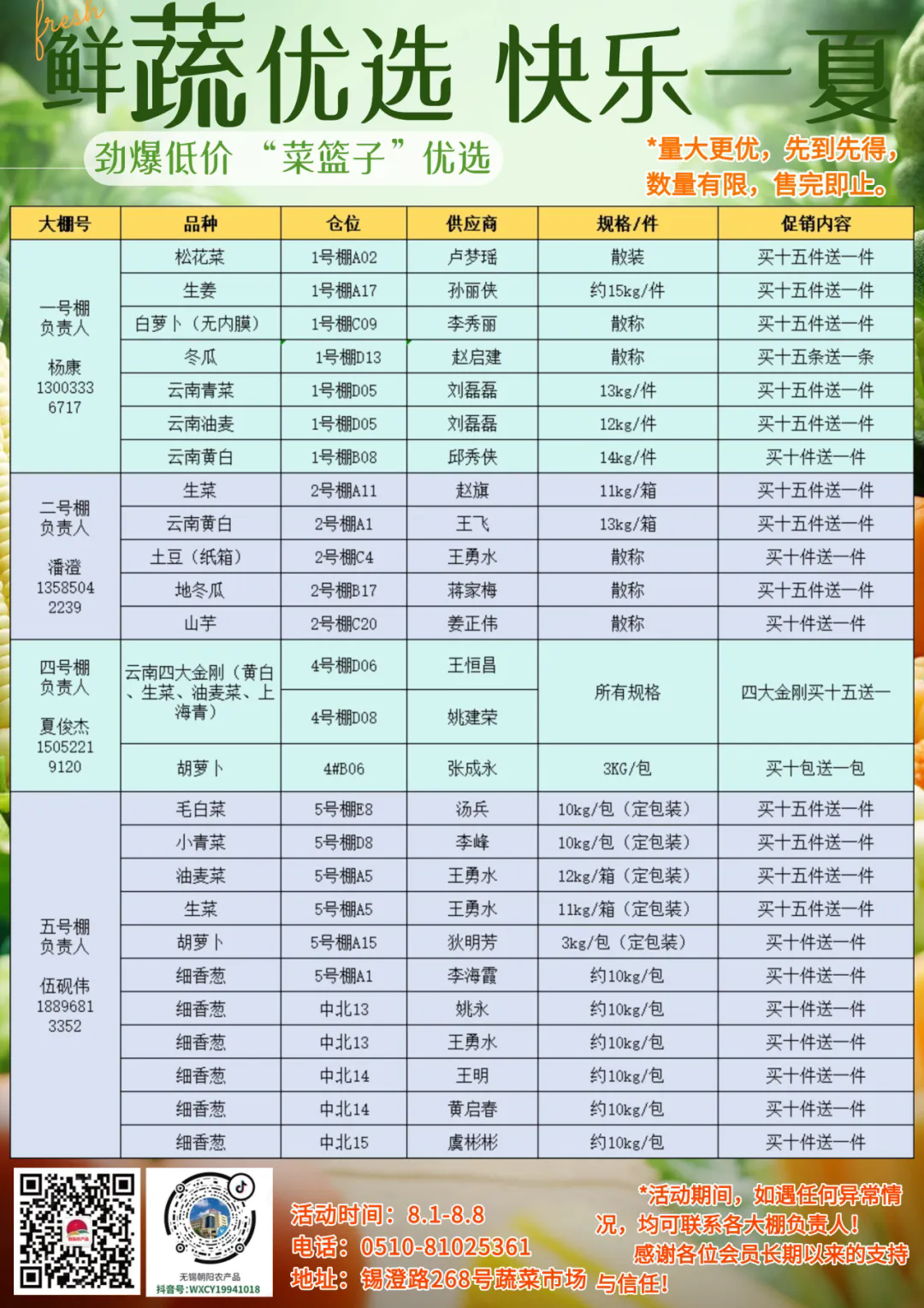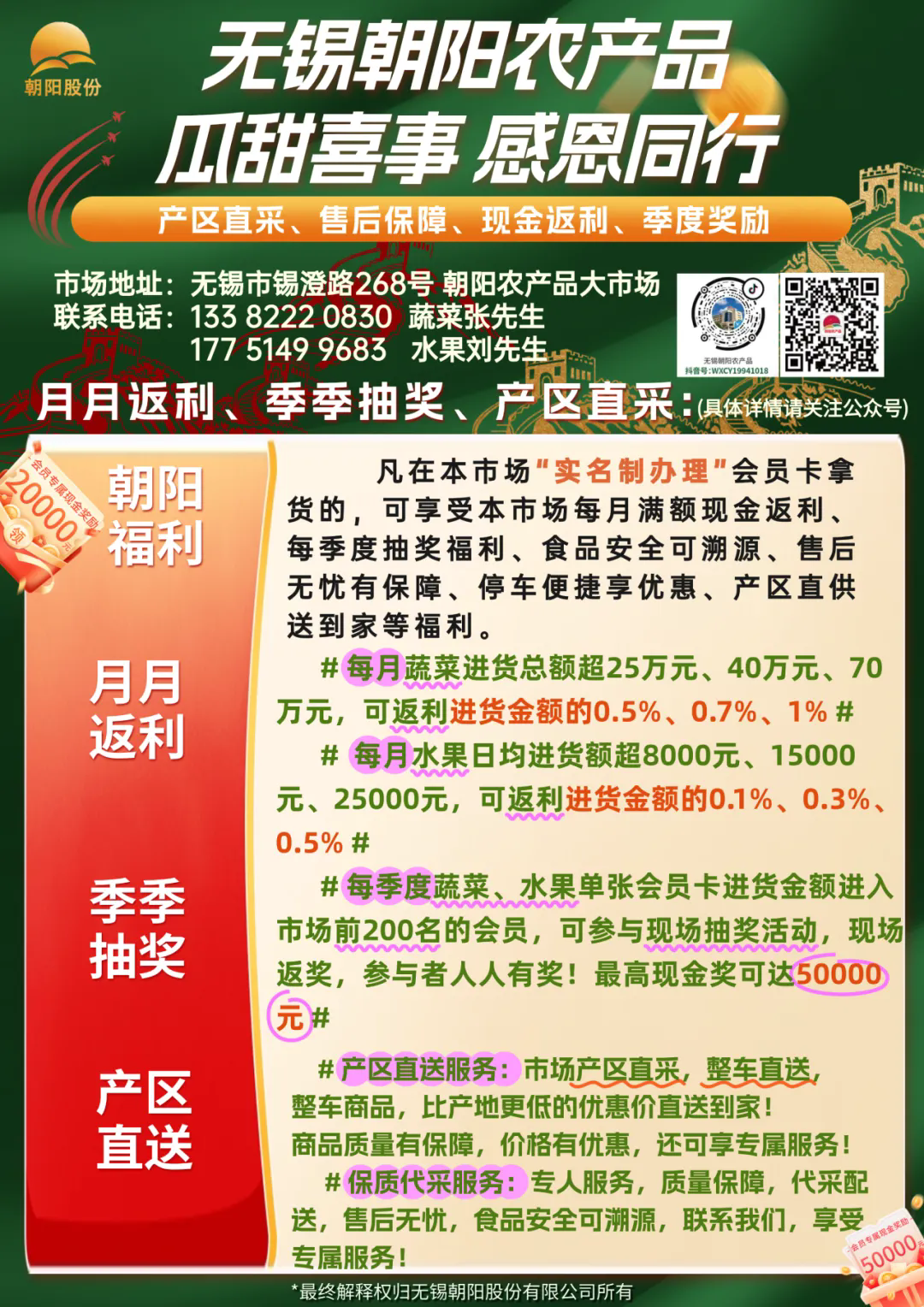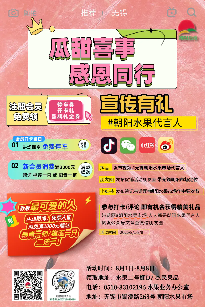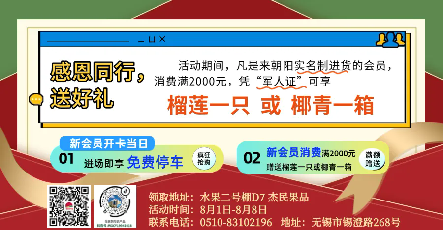 瓜甜喜事,感恩同行,朝陽與您共慶榮光! 當(dāng)甜蜜遇上擔(dān)當(dāng),致敬永不褪色。 在這個禮贊奉獻(xiàn)的時刻,無錫朝陽農(nóng)產(chǎn)品大市場也為大家準(zhǔn)備了一場“清涼盛宴” 這個夏天,就讓我們用最應(yīng)季的甜蜜,向這群“最可愛的人”道一聲:辛苦了! 讓清甜多汁的水果,新鮮健康的蔬菜,為這個夏天降溫,更向守護(hù)我們的最可愛的人傳遞一份暖心敬意。 活動期間,凡是來朝陽實名制拿貨的會員,消費(fèi)滿2000元,憑“軍人證”可享:榴蓮一只或椰青一箱。
