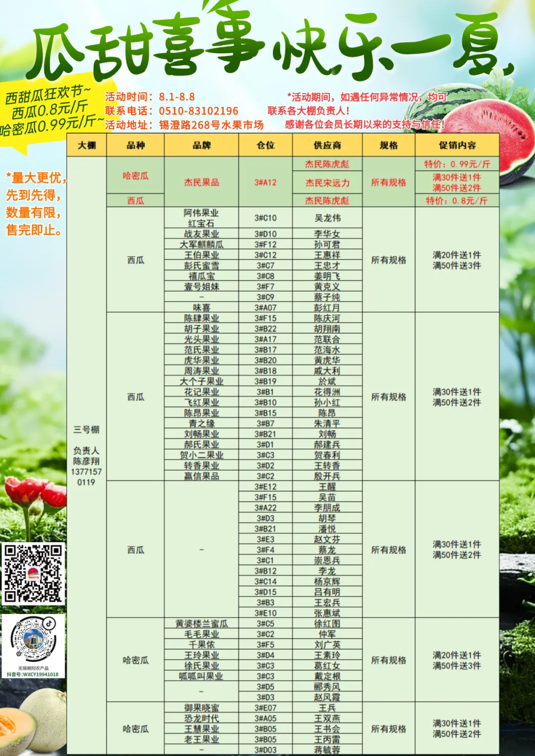 活動時間:8月1日-8月8日 市場地址:無錫市錫澄路268號 這個夏天,讓清甜的西瓜,甜瓜驅(qū)散炎熱,讓一份份暖心的敬意傳遞溫情。 無論是為家人準(zhǔn)備夏日解暑果,還是為致敬獻(xiàn)上一份心意,我們都在無錫朝陽農(nóng)產(chǎn)品大市場等您! 一起用甜蜜致敬擔(dān)當(dāng),讓這個夏天,充滿清涼與感動!