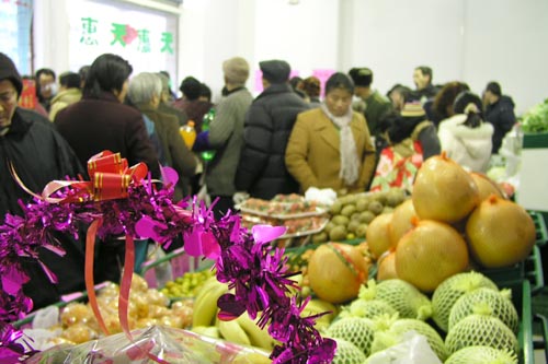 新年伊始,天惠超市敘豐里便民店開(kāi)業(yè)了。雖然是星期天,但一大早就有附近的居民來(lái)此等候,他們?cè)缫雅瓮軌蛴幸患姨旎莸杲o他們提供質(zhì)優(yōu)價(jià)廉的新鮮蔬菜、豬肉等商品。小小的店堂不一會(huì)就被擠得滿滿當(dāng)當(dāng)。顧客們表示,要是店面再大一點(diǎn)就更好了。