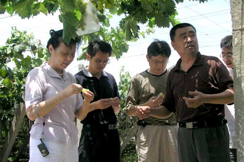 過去我市出產的葡萄品種主要從地理、氣候條件相近的日本引進,而近年新“加盟”的則是“歐亞雜交”品種,原產地在東歐。由于兩地自然條件差異較大,對種植技術、田間管理提出了更高要求。近幾年蠡園葡萄協會加大了對果農的培訓力度,定期從北京等地聘請農業專家前來授課,并加快了新技術推廣。今年夏季持續高溫干旱,蠡湖街道的果農普遍使用了“控果技術”、“滴灌技術”等,使千余畝葡萄種植園安渡難關。據介紹,今年不同品種的“雙虹”牌葡萄總產量可達1500噸以上,其中優質葡萄(特級和一級品)預計占80%以上,比過去有很大增長。